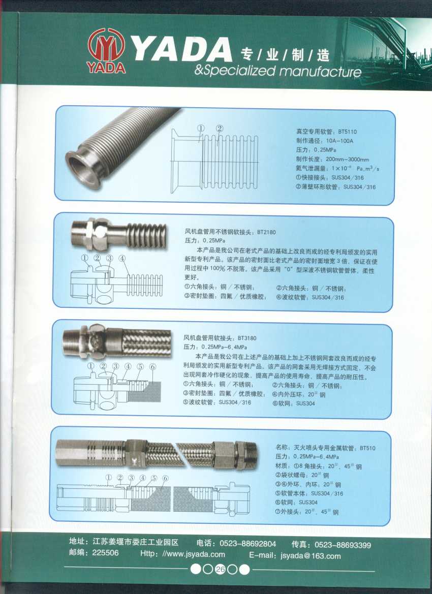 秉天時 籍地利 仰人和 虔誠一個永恒的理念,創(chuàng)新永續(xù).百諾不如一信,亞達人堅持以信為本,視客戶如同上帝,把對信譽的追求,體現(xiàn)在嚴格的質量控制和完善的客戶服務上,讓客戶百分之百滿意是亞達人不變的信念。 本廠系ISO9001質量認證企業(yè)、計量合格企業(yè)。本廠專業(yè)致力于生產不銹鋼金屬波紋軟管、超高壓、高壓膠管、波紋管補償器(膨脹節(jié))、立式、臥式、冷卻器。本廠產品具有承受壓力高、彎曲半徑小、抗疲勞性能強、使用壽命長等特點。廣泛應用于電力、石化、冶金、水泥建材、工程機械、礦山及液壓系統(tǒng)。產品暢銷全國各地。 今日亞達之成功源自諸多客戶的厚愛,明天的輝煌更離不開您對我的支持與信賴。查看更多>>